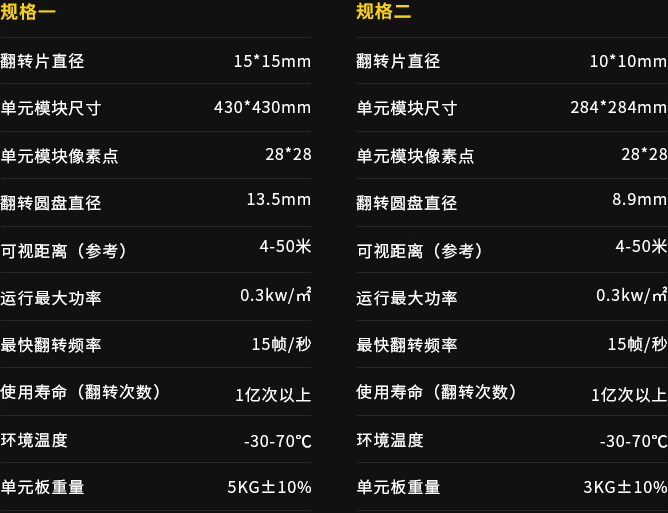 常规单元尺寸:100*100、150*150、200*200(厘米) 单元功率:5W 运动幅度:最大20厘米 运动速度:最快每秒10厘米 常规颜色:白色、黑色 模组材质:工程塑料 支持协议:CAN、UDP、RS485、DMX512 定制支持:可定制